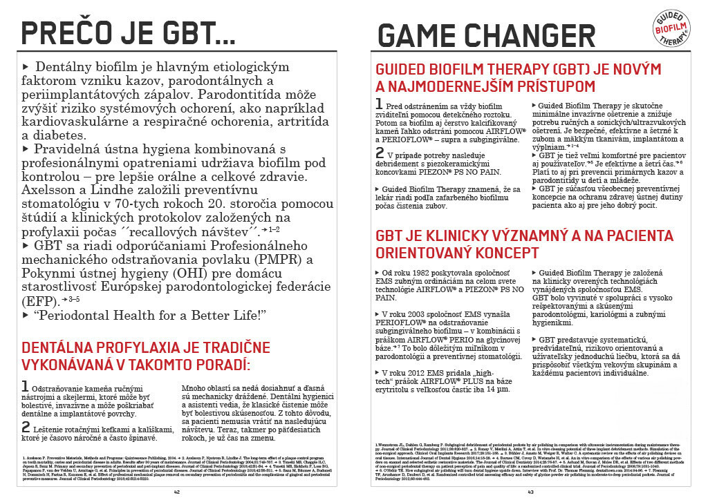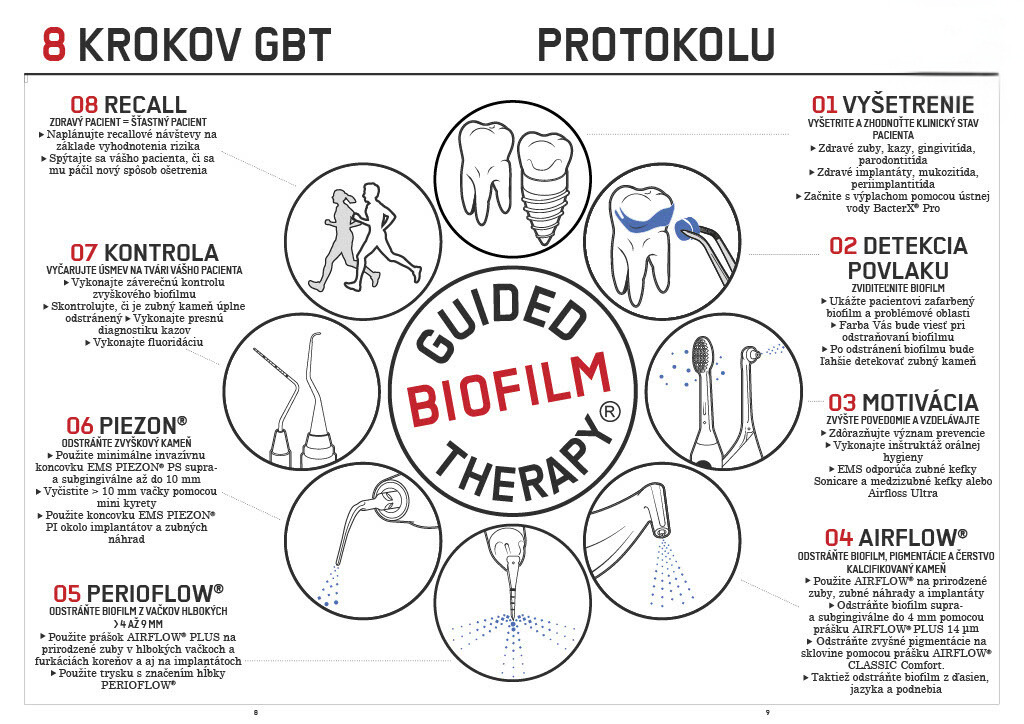Guided Biofilm Therapy (GBT®) je švajčiarska inovatívna, vedecky podložená metóda dentálnej hygieny, ktorá zaisťuje precízne odstránenie zubného biofilmu pomocou špičkových technológií AIRFLOW® a PERIOFLOW®.